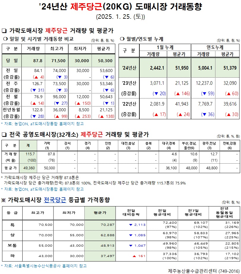 '24년산 제주당근(20kg) 도매시장 거래동향(1/25)