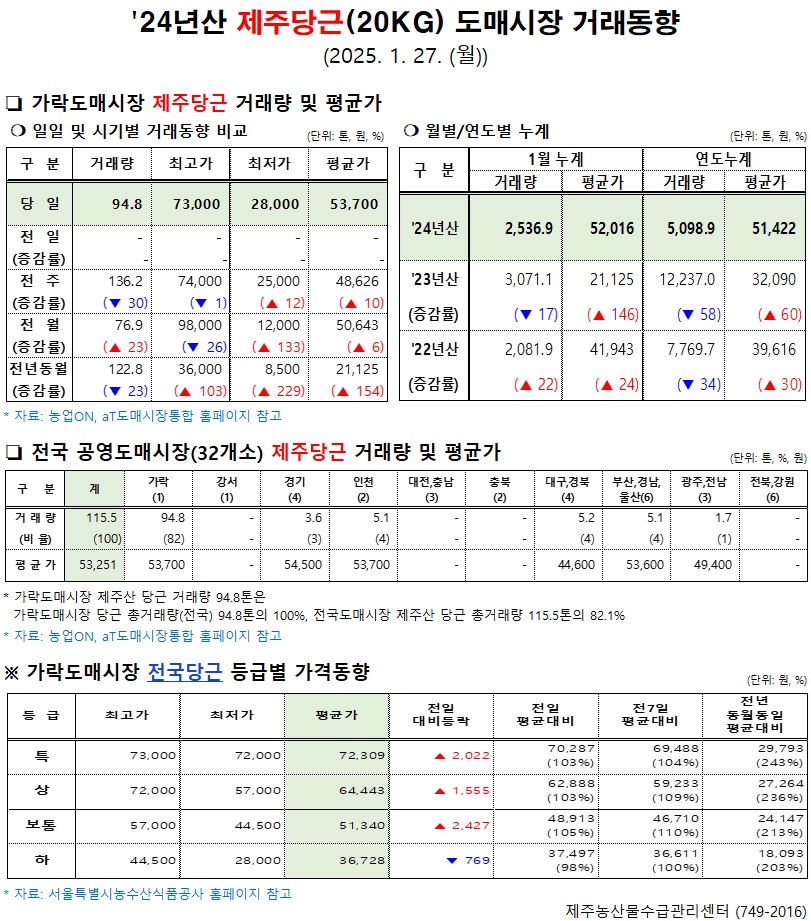 '24년산 제주당근(20kg) 도매시장 거래동향(1/27)