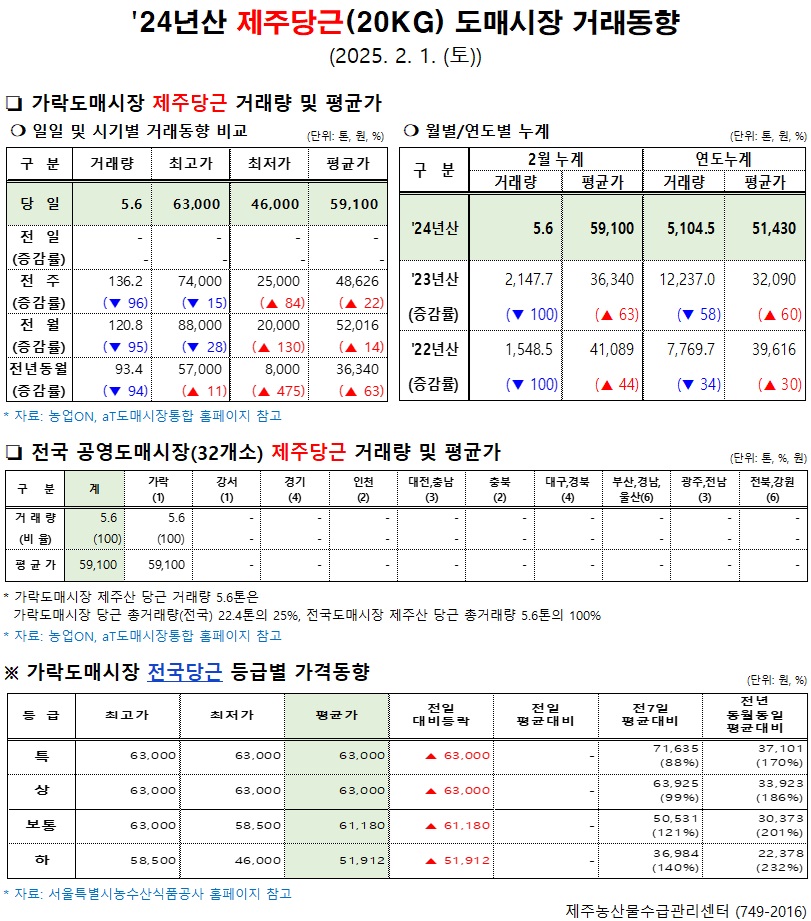 '24년산 제주당근(20kg) 도매시장 거래동향(2/1)