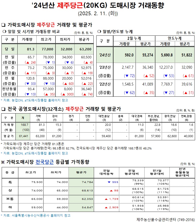 '24년산 제주당근(20kg) 도매시장 거래동향(2/11)