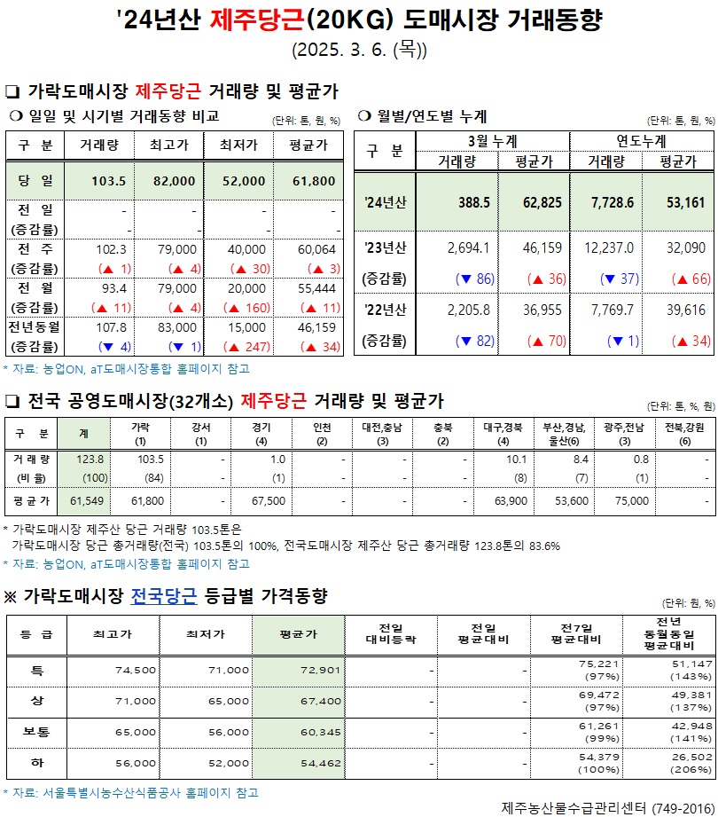 '24년산 제주당근(20kg) 도매시장 거래동향(3/6)