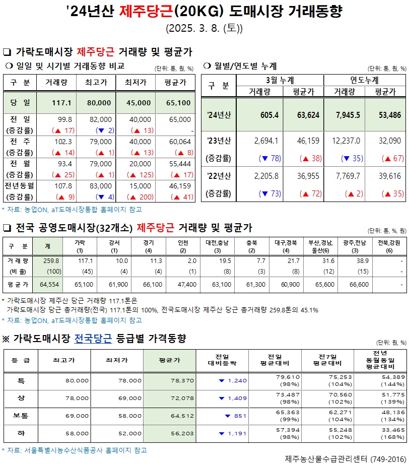 '24년산 제주당근(20kg) 도매시장 거래동향(3/8)