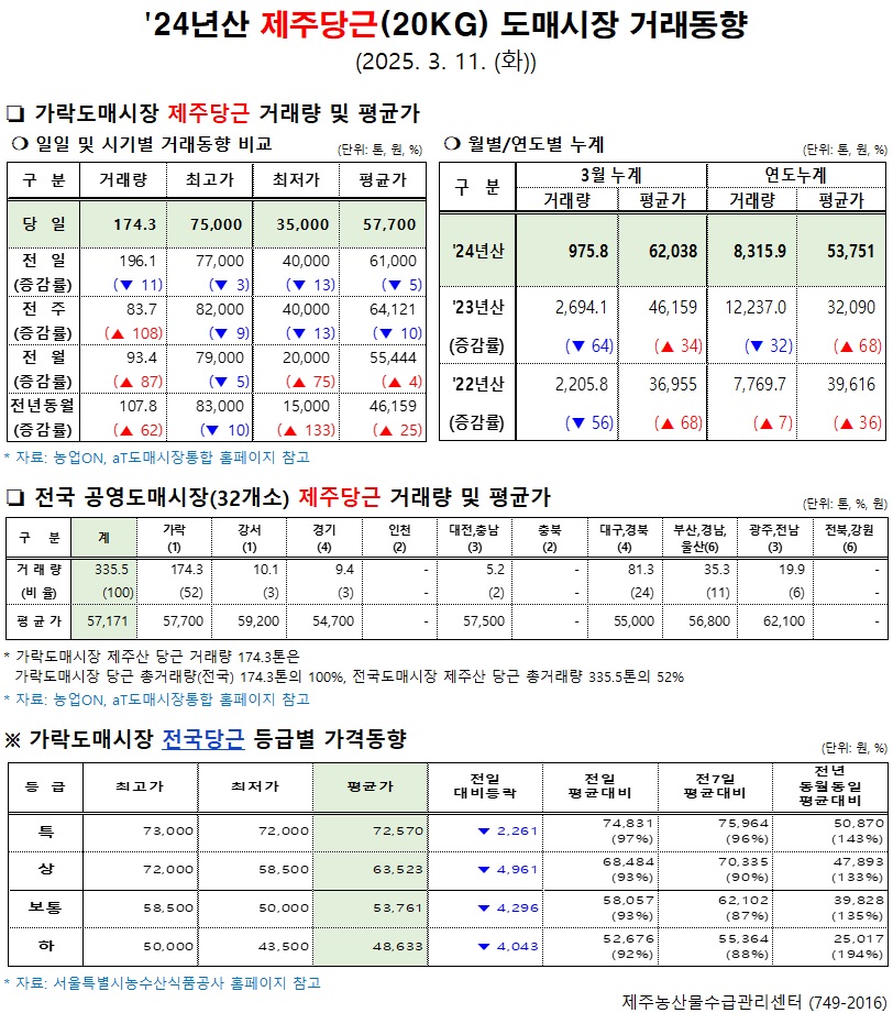 '24년산 제주당근(20kg) 도매시장 거래동향(3/11)