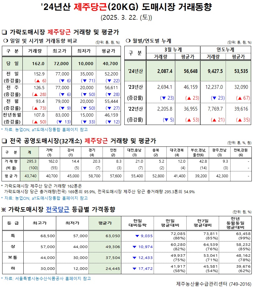 '24년산 제주당근(20kg) 도매시장 거래동향(3/22)
