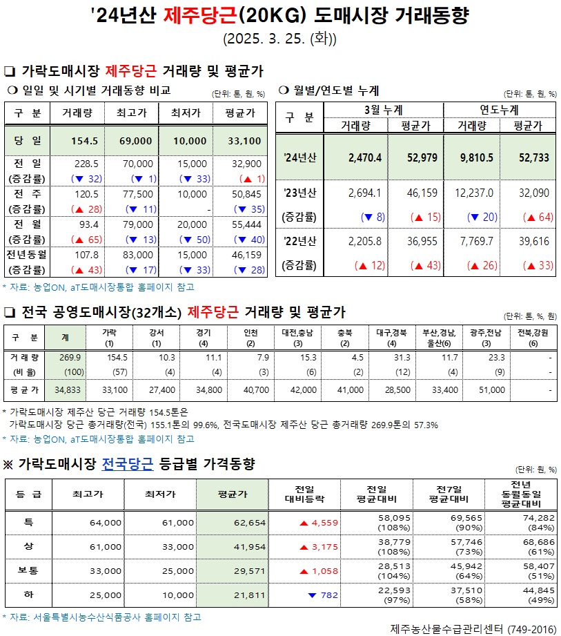 '24년산 제주당근(20kg) 도매시장 거래동향(3/25)