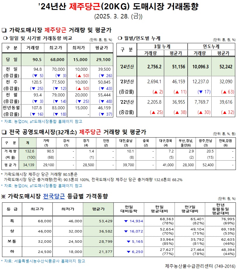 '24년산 제주당근(20kg) 도매시장 거래동향(3/28)