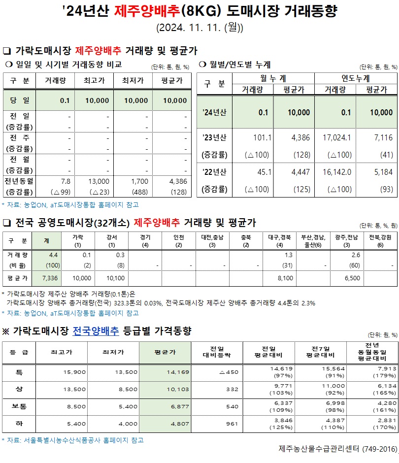 '24년산 제주양배추(8kg) 도매시장 거래동향(11/11)