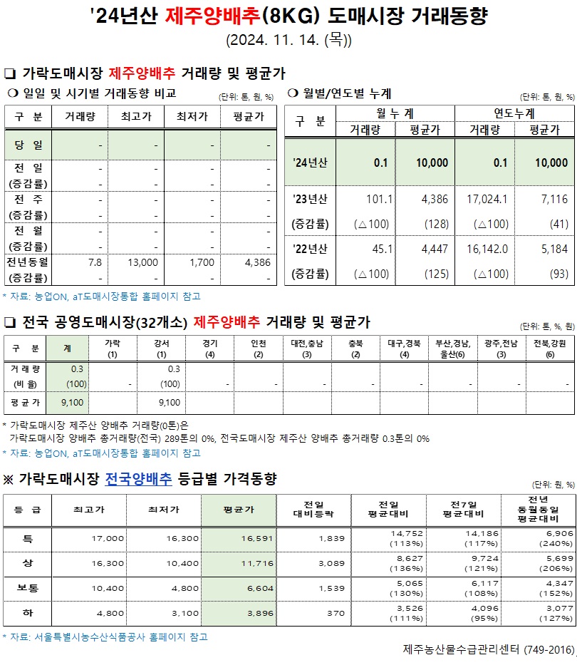 '24년산 제주양배추(8kg) 도매시장 거래동향(11/14)