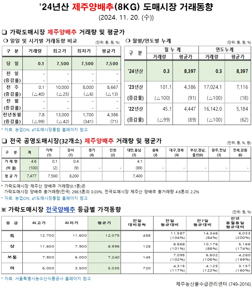'24년산 제주양배추(8kg) 도매시장 거래동향(11/20)