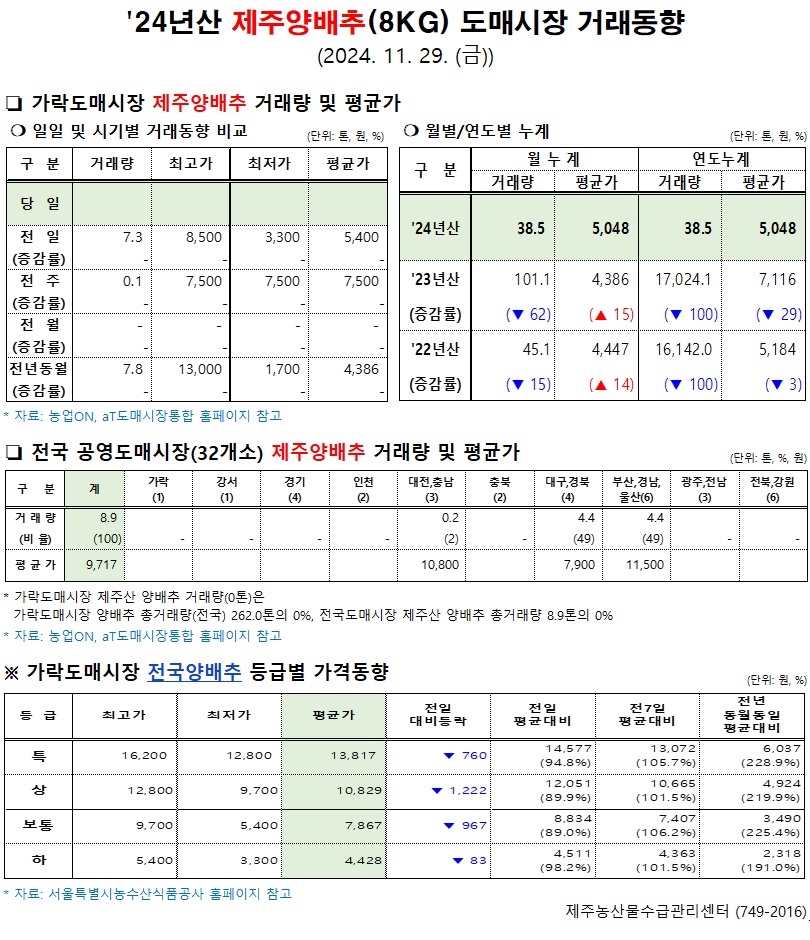 '24년산 제주양배추(8kg) 도매시장 거래동향(11/29)