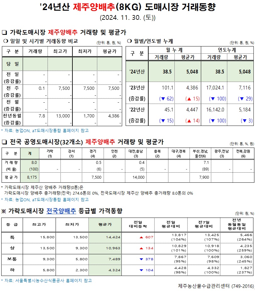 '24년산 제주양배추(8kg) 도매시장 거래동향(11/30)