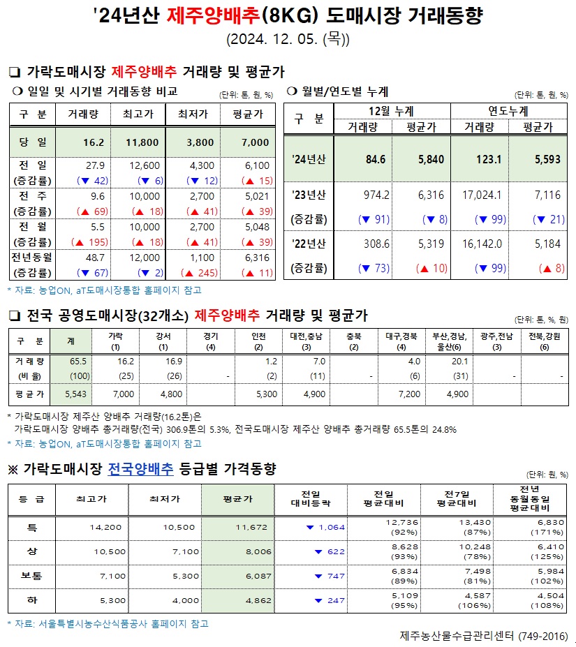 '24년산 제주양배추(8kg) 도매시장 거래동향(12/05)