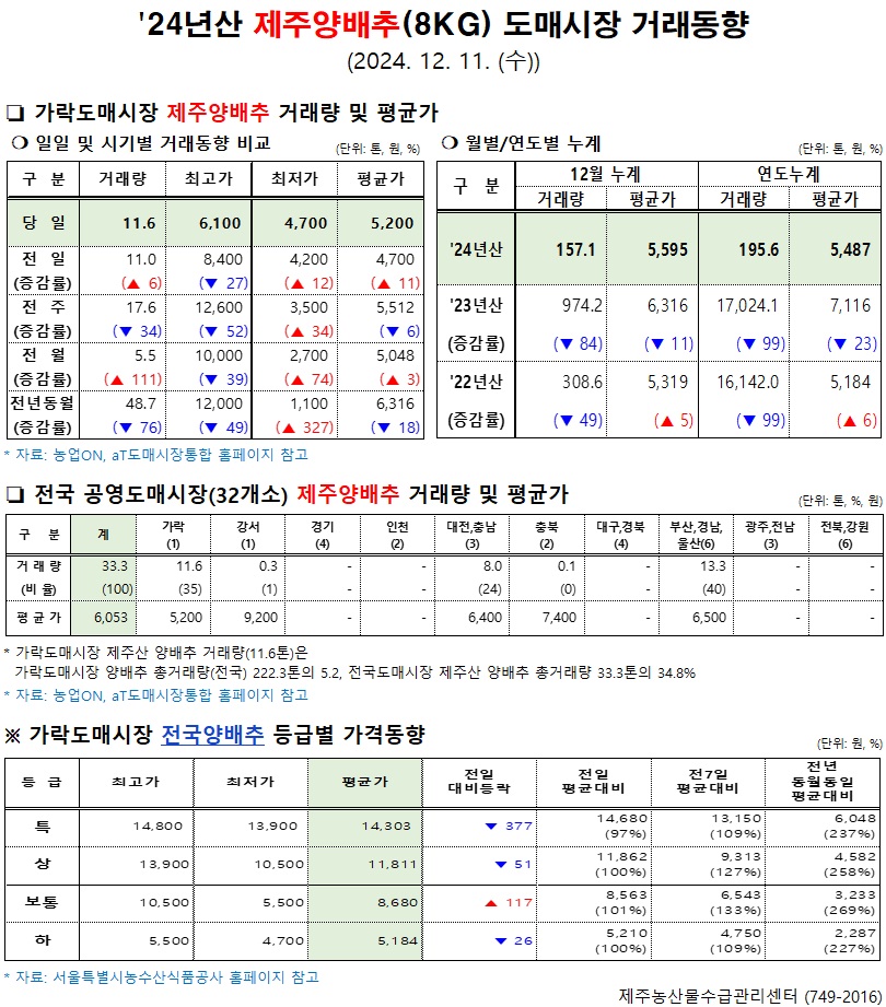 '24년산 제주양배추(8kg) 도매시장 거래동향(12/11)