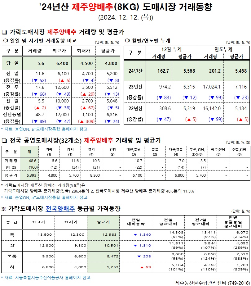 '24년산 제주양배추(8kg) 도매시장 거래동향(12/12)