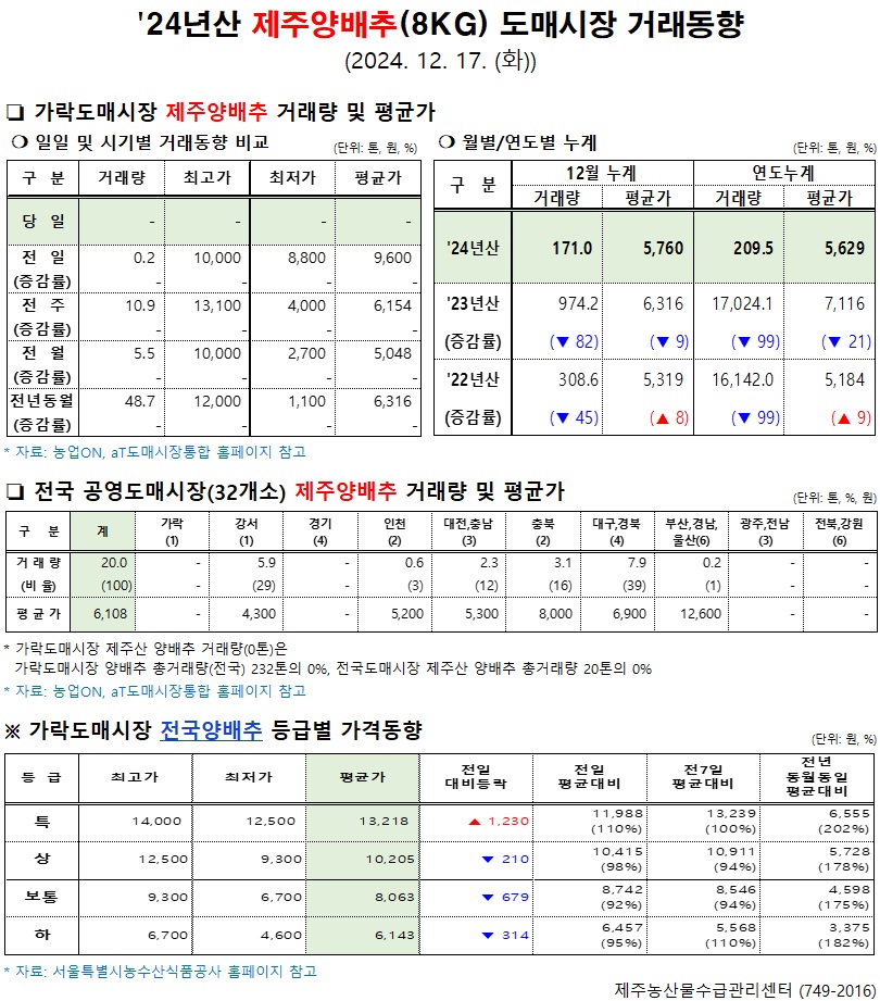 '24년산 제주양배추(8kg) 도매시장 거래동향(12/17)