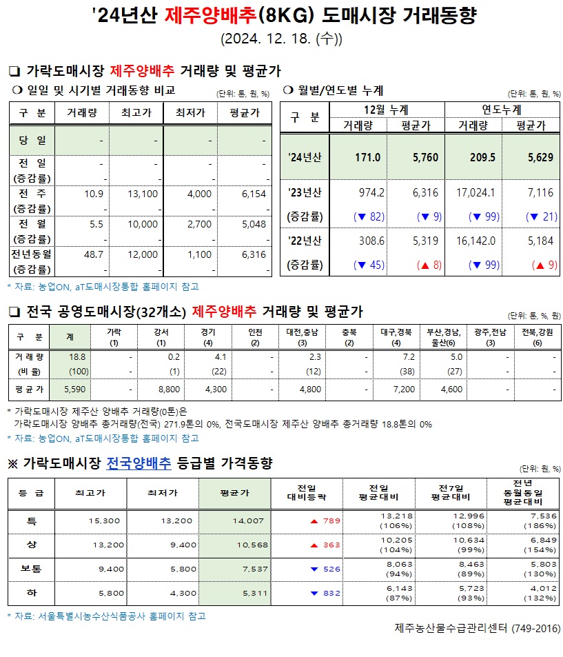 '24년산 제주양배추(8kg) 도매시장 거래동향(12/18)