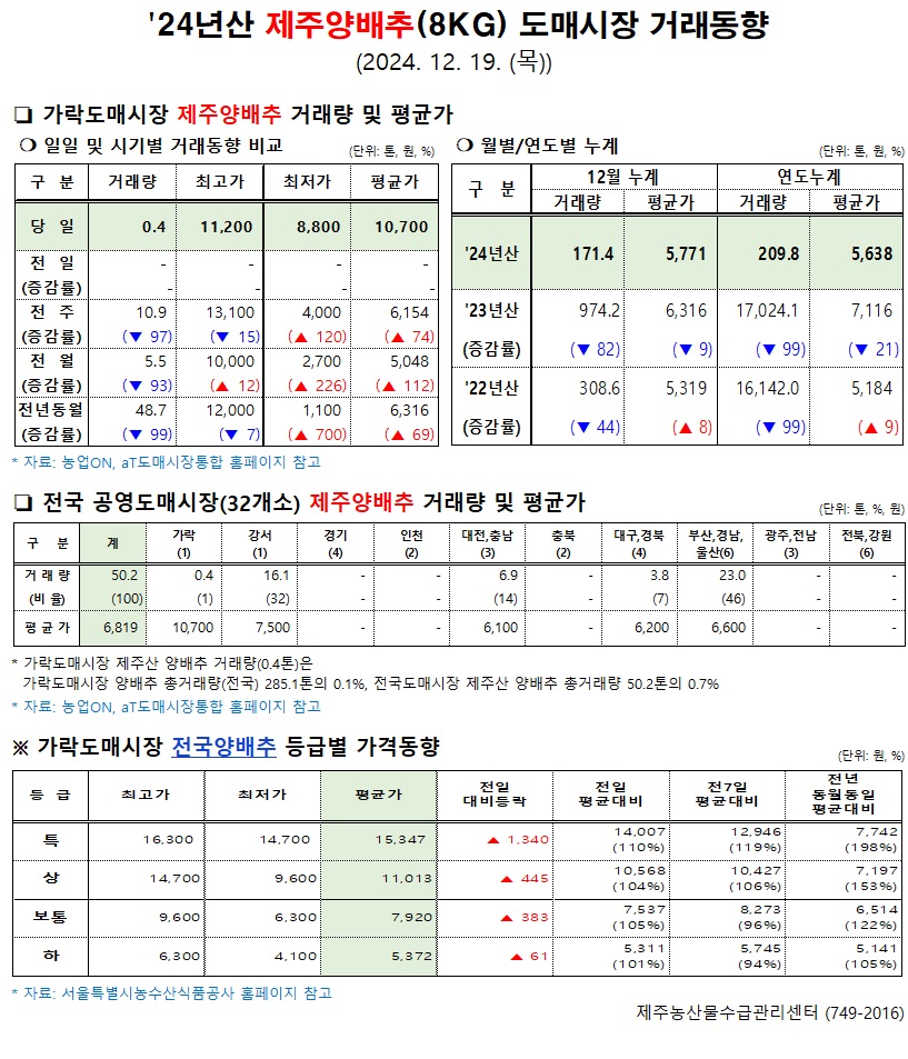 '24년산 제주양배추(8kg) 도매시장 거래동향(12/19)