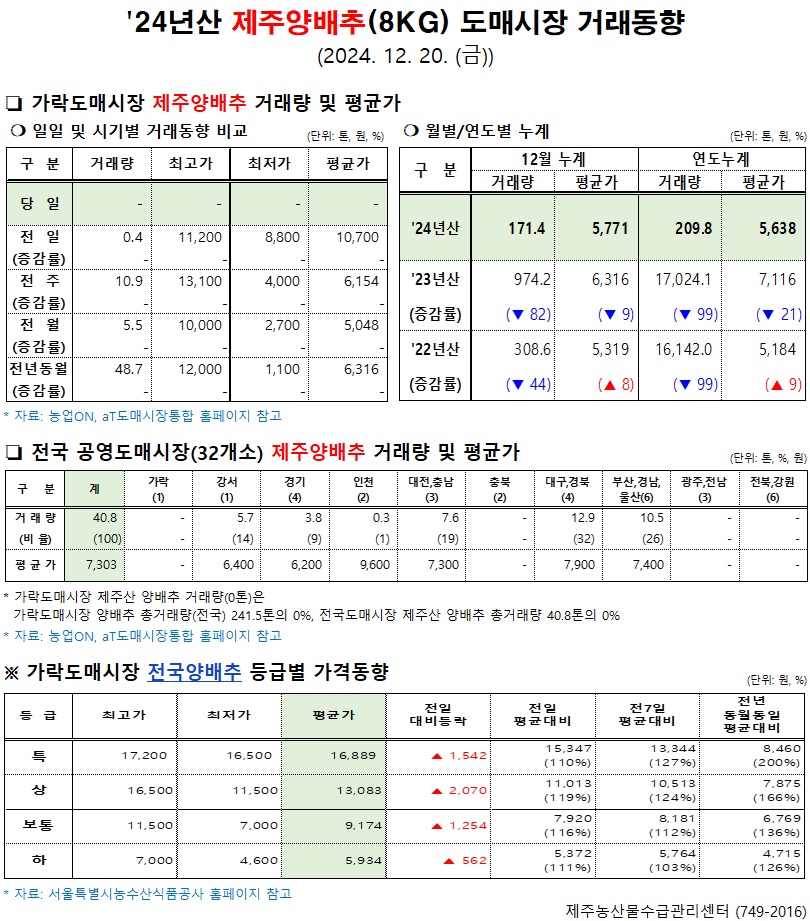 '24년산 제주양배추(8kg) 도매시장 거래동향(12/20)