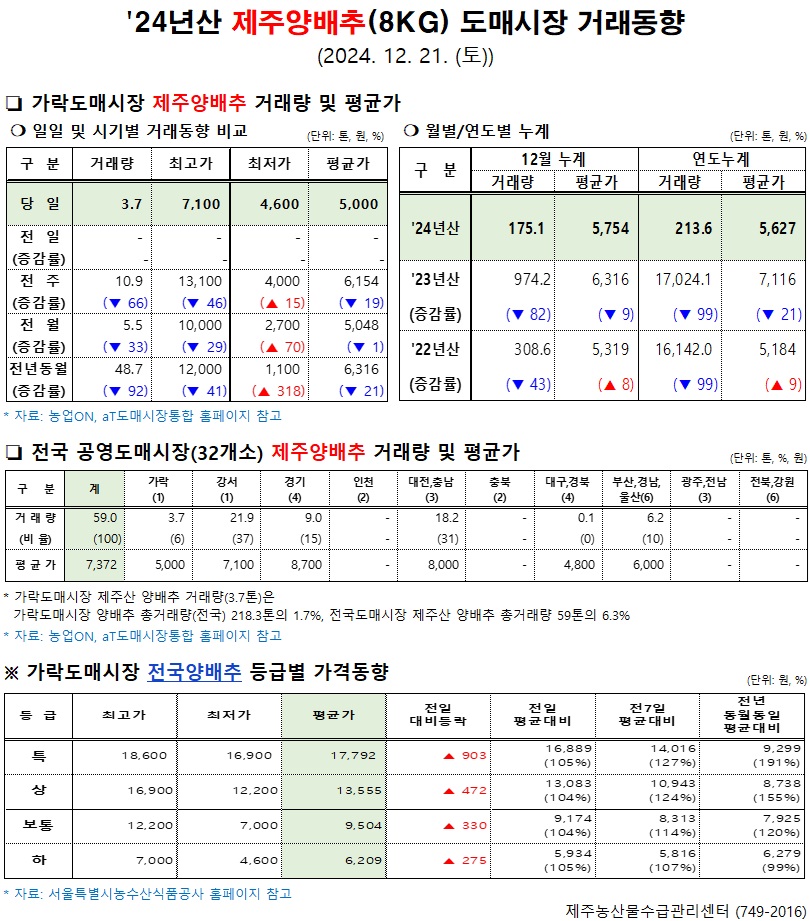 '24년산 제주양배추(8kg) 도매시장 거래동향(12/21)