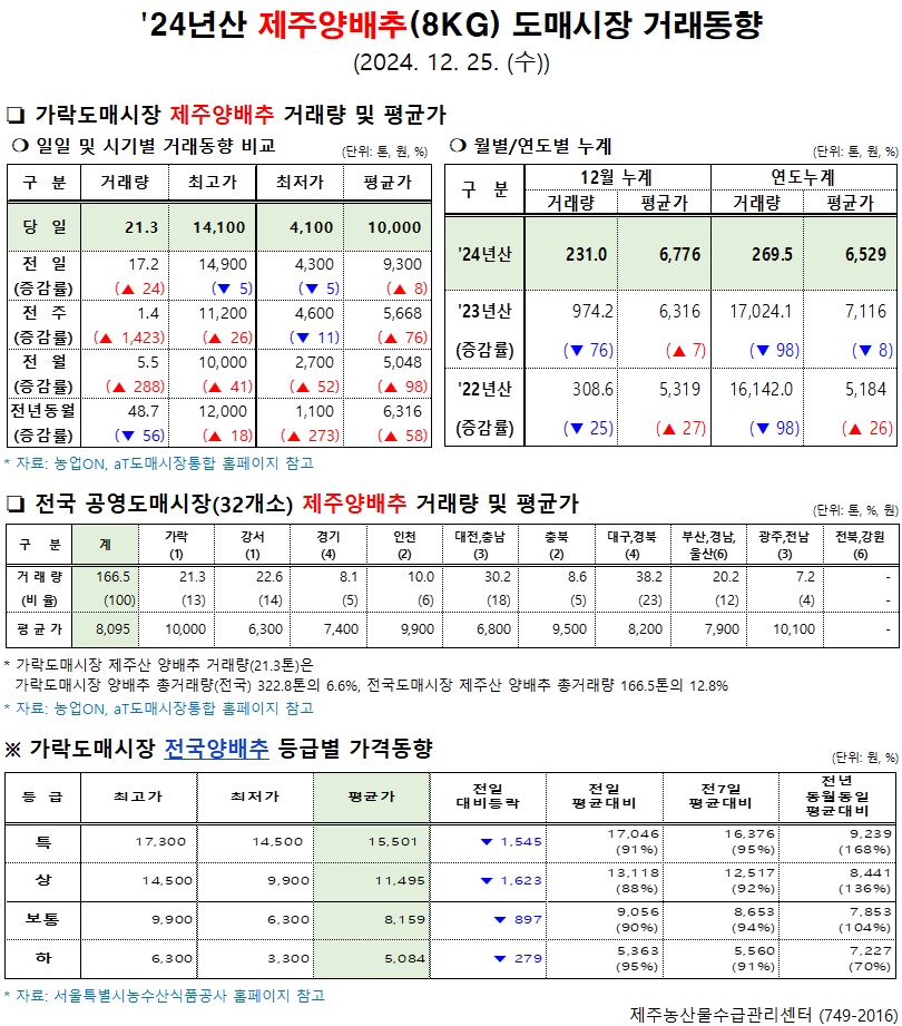 '24년산 제주양배추(8kg) 도매시장 거래동향(12/25)