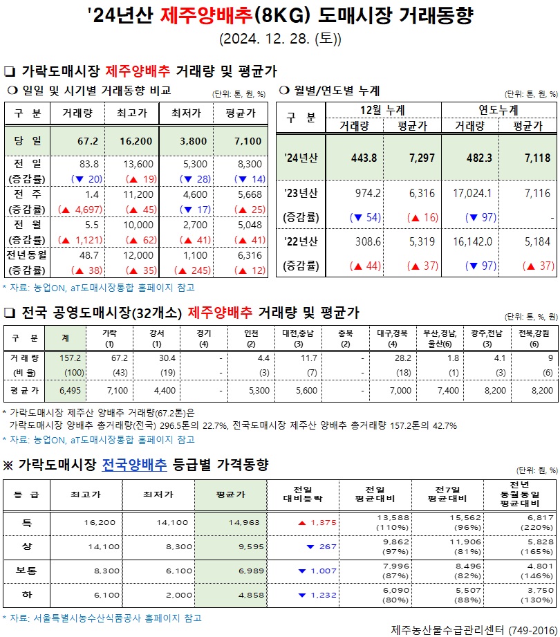 '24년산 제주양배추(8kg) 도매시장 거래동향(12/28)