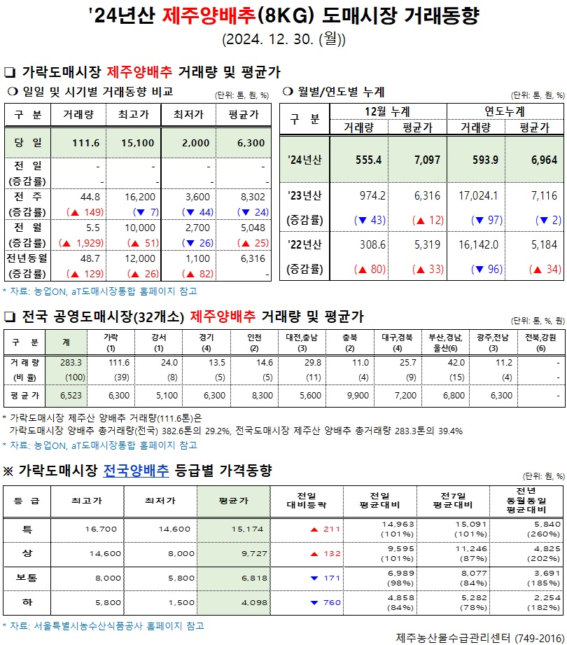 '24년산 제주양배추(8kg) 도매시장 거래동향(12/30)