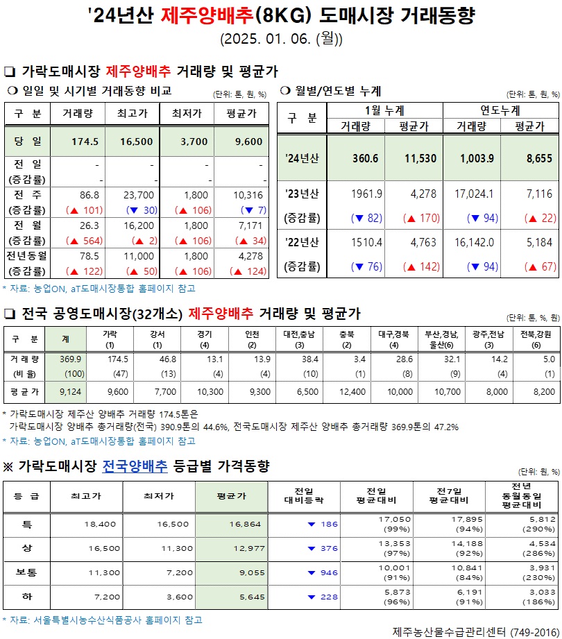 '24년산 제주양배추(8kg) 도매시장 거래동향(1/6)