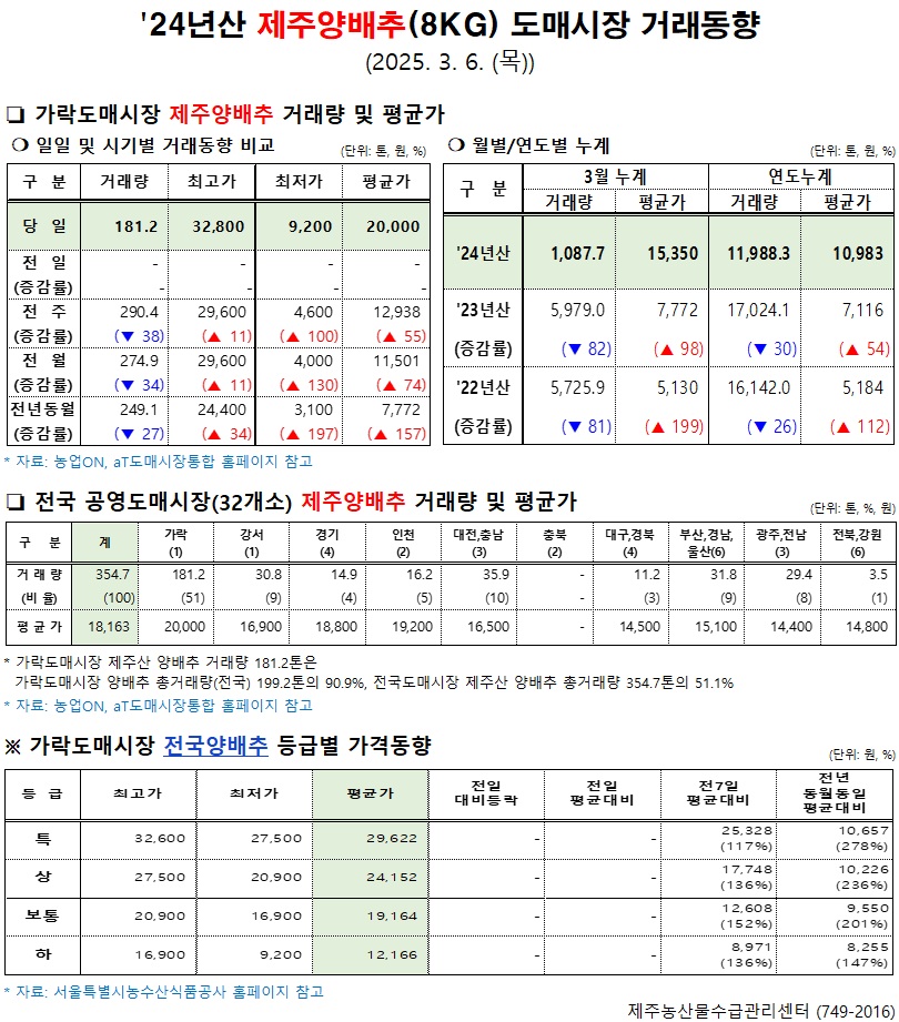 '24년산 제주양배추(8kg) 도매시장 거래동향(3/6)