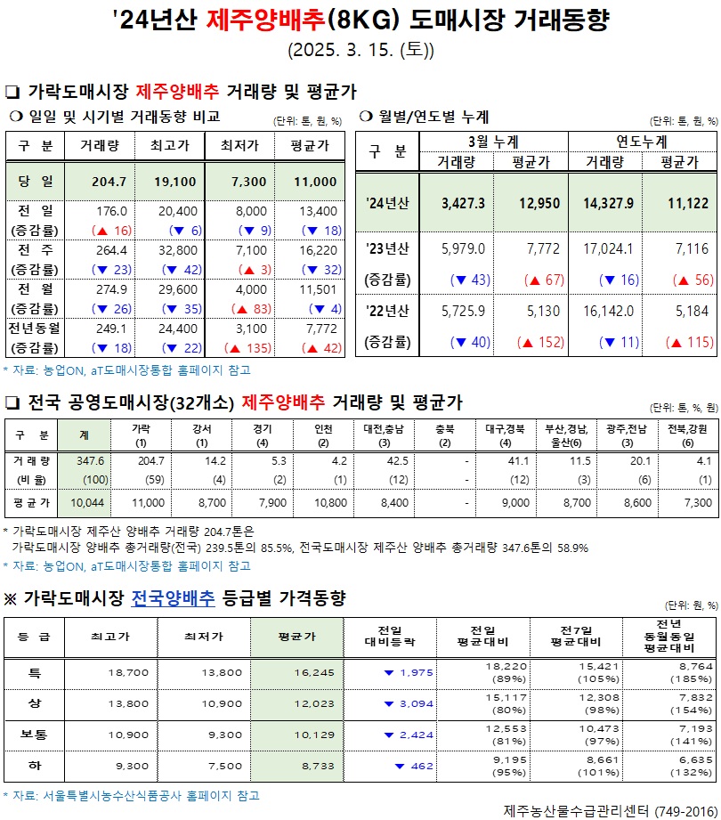'24년산 제주양배추(8kg) 도매시장 거래동향(3/15)