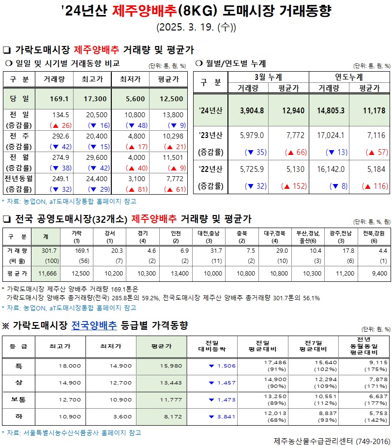 '24년산 제주양배추(8kg) 도매시장 거래동향(3/19)