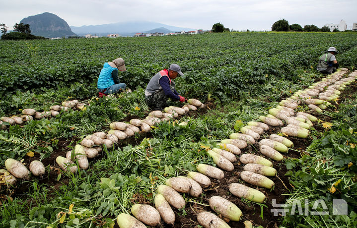 정체전선이 북상 중인 12일 오전 제주 서귀포시 대정읍 상모리 인근에서 농민들이 장맛비가 내리기 전 서둘러 봄무를 수확하고 있다.