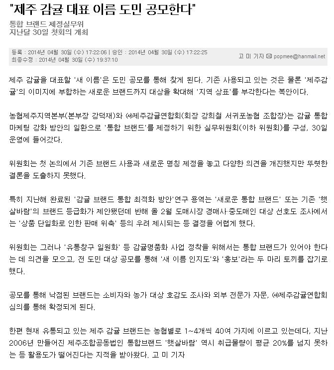 "제주 감귤 대표 이름 도민 공모한다"