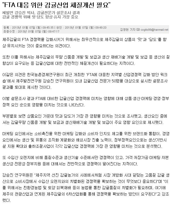 "FTA 대응 위한 감귤산업 체질개선 필요"