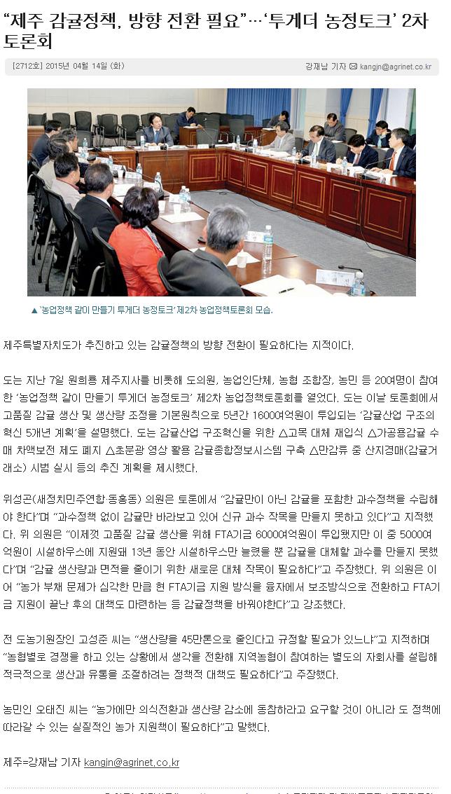 "제주감귤정책,방향전환필요".."투게더 농정토크'2차토론회