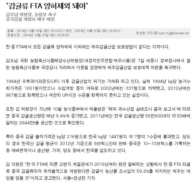 "감귤류 FTA양허제외 돼야"